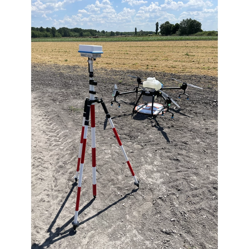 A háromlábú állványra szerelve bekapcsolt RTK egység pozicionálási korrekciós jelet küld a drón számára, amely így akár centiméteres pontossággal képes dolgozni.
