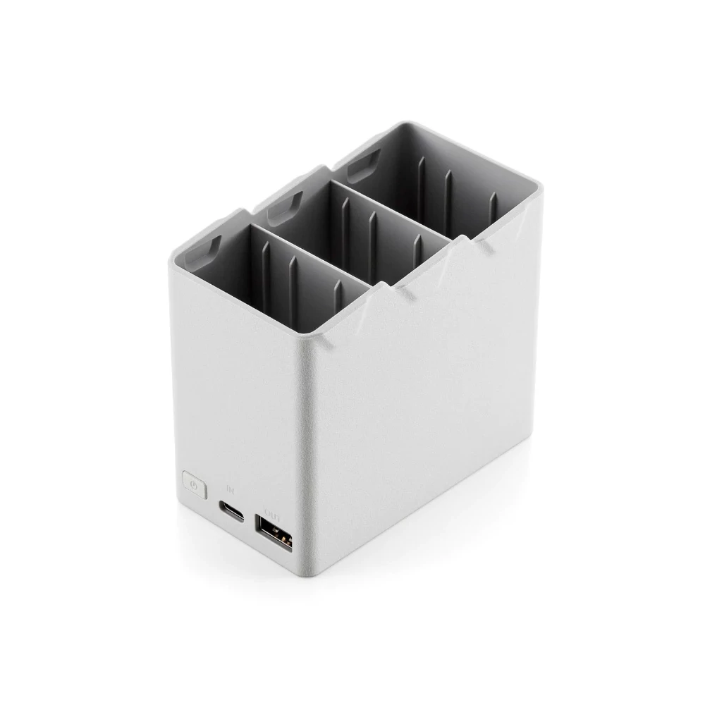 A két irányú HUB töltőközpont képes a távirányítót és a három akkumulátort egymás után tölteni. Power Bank áramforrásként is használható USB-vel tölthető eszközökhöz.