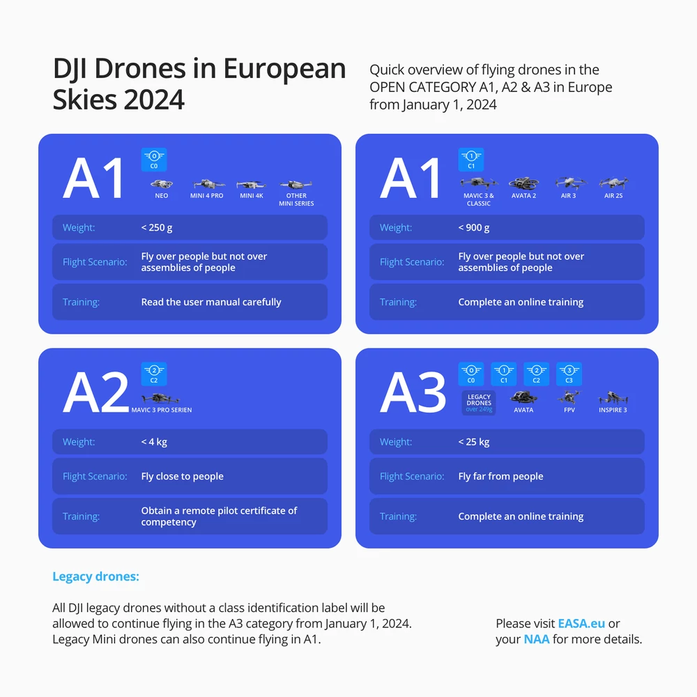 A DJI Neo drón EU tömegkategória besorolása: C0, mellyel lakott területen kívül 120 méteres magasságig szabad légtérben drónpilóta végzettség és biztosítás nélkül is repülhetsz. Lakott terület feletti repüléshez szükséged lesz EU A1/A3 végzettségre és biztosításra is.