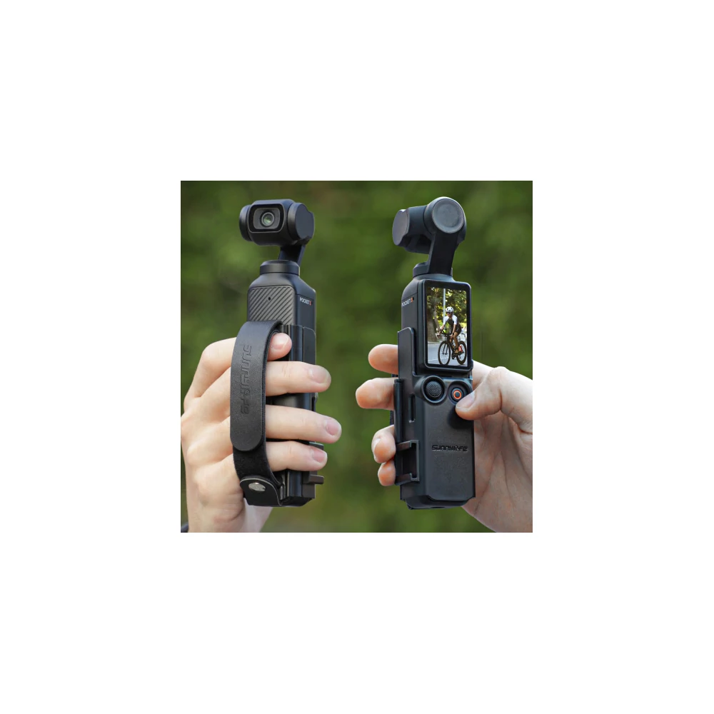 Műanyag védőtok markolat tépőzáras bőr pánttal DJI Pocket 3 kamerákhoz. A könnyedén felhelyezhető tok védelmet biztosít a kamera számára, miközben biztonságosan hordható kézben. Sőt a vakupapucsos rögzítő adapter számos akciókamera kiegészítőhöz csatlakoztatását is lehetővé teszi. A tartó alul nyitott, így a kamera alján található 1/4 colos fotós menettel további kiegészítők is csatlakoztathatók.