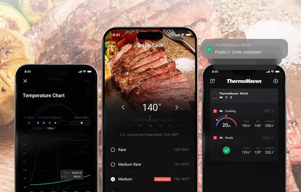 A ThermoMaven alkalmazással még kényelmesebben süthetsz. Segítségével nemcsak a hőmérsékletet figyelheted távolról, hanem a beállított értékek elérésekor automatikus értesítési funkciót is használhatsz. Az intelligens opciókkal az alkalmazás megkönnyíti a sütést, időt és energiát takarít meg, így a sütéshatékonyabbá és kevésbé stresszessé válik.